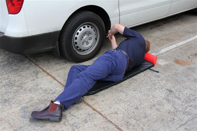The vinyl covered foam mat folds out to full length for under vehicle work and also folds easily for storage. |